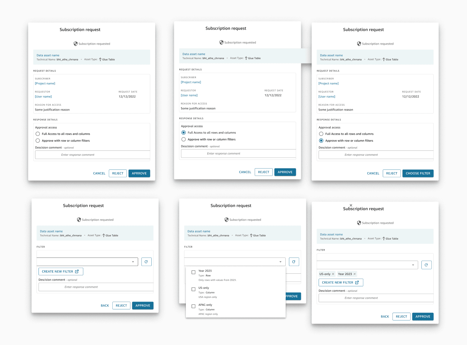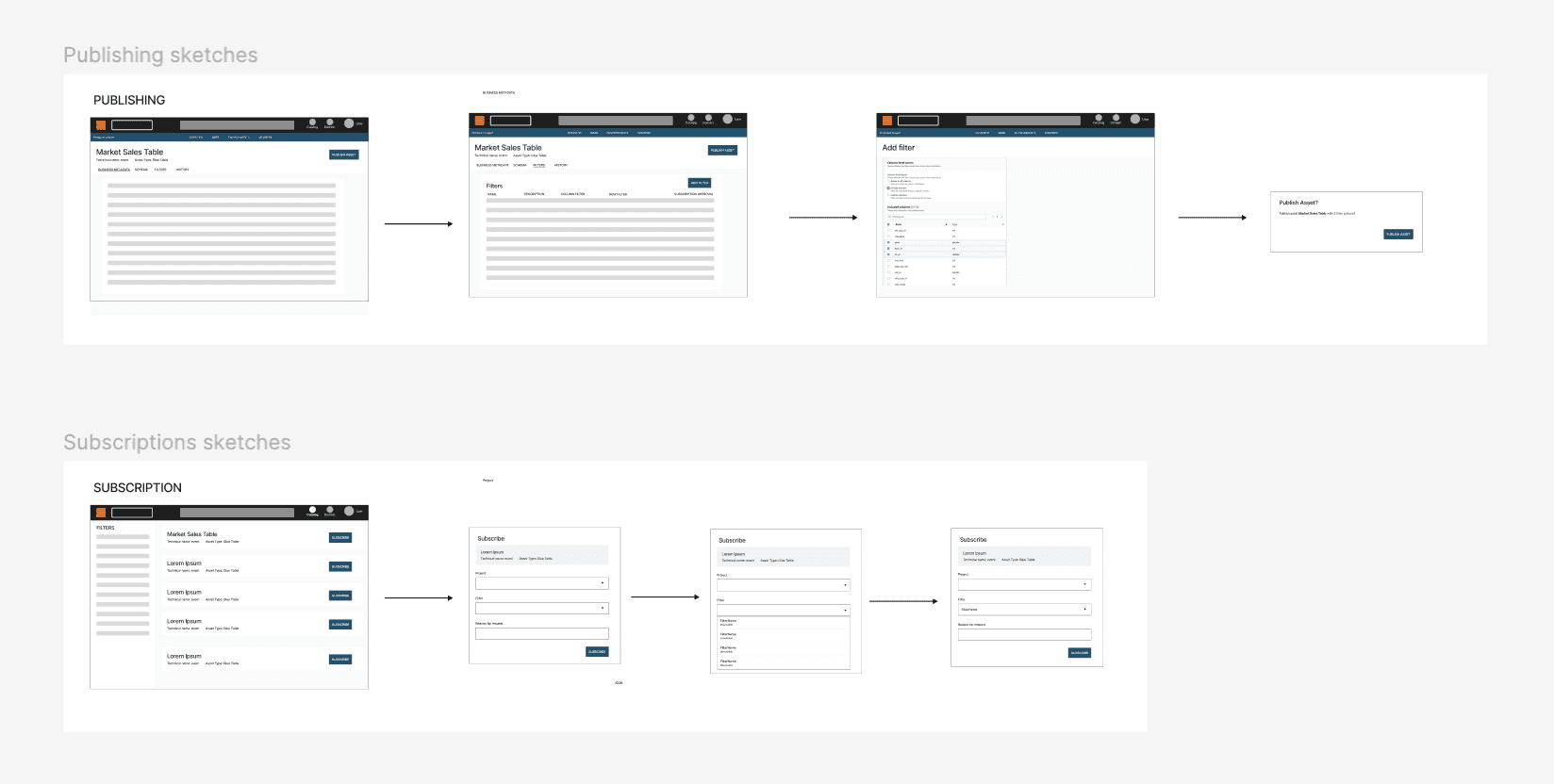 I created some initial wireframing to help inform further conversation and make sure that we were aligned with our back-end engineers. From these we made a decision to keep all data permissioning on the publisher side, subscriber wouldn’t know about any missing columns or rows from their data set at all.